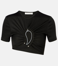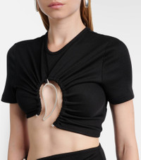 Christopher Esber's sensual cuts and sculptural hardware add a contemporary twist to minimalism. The Paisley short-sleeved, cropped T-shirt is gathered toward a curved opening, framed by the brand's signature paisley hardware. Product Details - Material: 96% polyester, 4% elastane - Care instructions: dry clean - Made in Vietnam - Designer color name: Black - Item color: black - Hardware color: silver - Details: 100% copper - Collar: crewneck - Item number: P01048202 Size & Fit - True to size - Fitted - Stretchy fabric - Cropped - The model seen in the picture is 178cm-5'10" and wearing a size UK 6