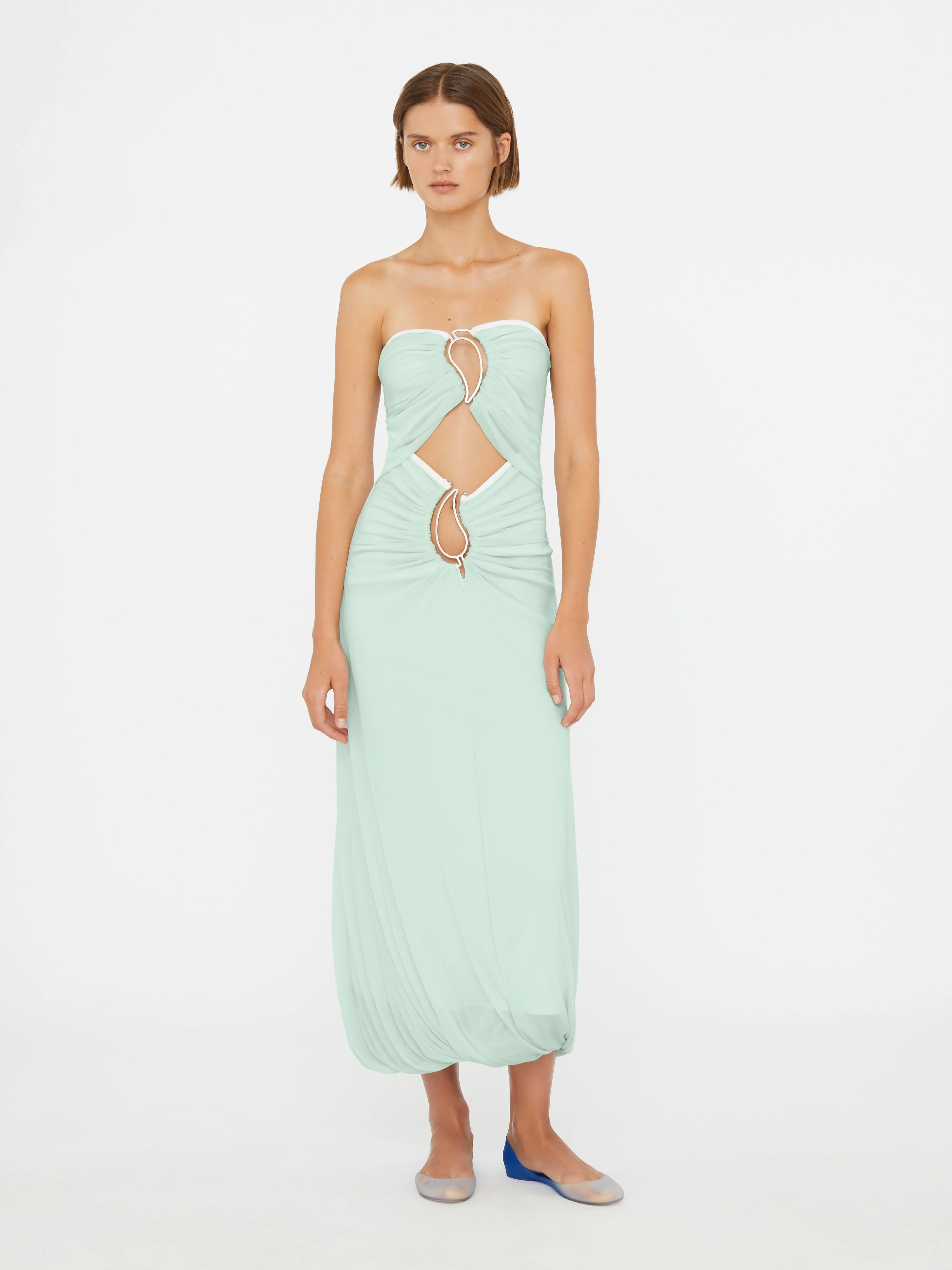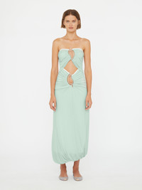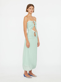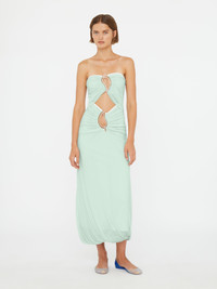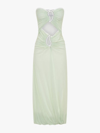 The Paisley Overlay Encased Strapless Dress is crafted in soft jersey and cut to a fluid maxi silhouette. A sculpted strapless neckline highlights the decolletage, while a bubble hem and directional ruching accentuate movement and form. Sculptural cutouts through the bodice are framed by signature metal paisley hardware. - Fluid maxi silhouette - Strapless neckline - Soft jersey fabrication - Gathered draping at the hem - Sculptural cutouts through the bodice - Signature metal paisley hardware - Main: 96% Polyester 4% Spandex - Hardware: 100% Copper - Dry Clean Only Model is 180cm/5'11" and wears size AU 8 (US 4) AU sizing