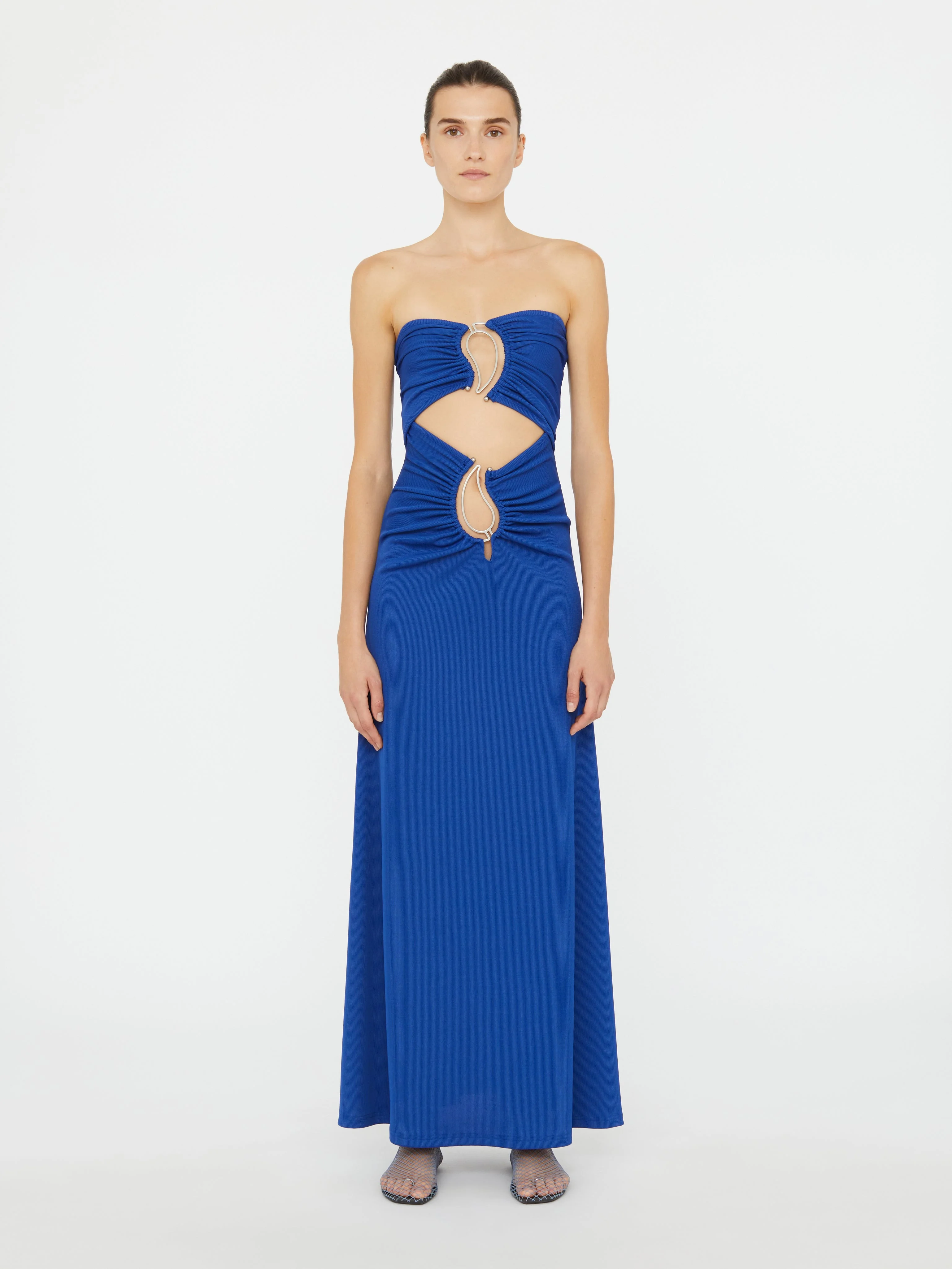 The Paisley Ruched Disconnect Strapless Dress crafted to a clean, column silhouette with directional ruching through the bodice. Sculptural cutouts at the torso are framed by signature metal paisley hardware. - Maxi column silhouette - Strapless neckline - Soft jersey fabrication - Gathered draping at the hem Ruching at bodice - Sculptural cutouts through the bodice - Signature metal paisley hardware - Main: 96% Polyester 4% Spandex - Hardware: 100% Copper - Dry Clean Only Model is 180cm/5'11" and wears size AU 8 (US 4) AU sizing