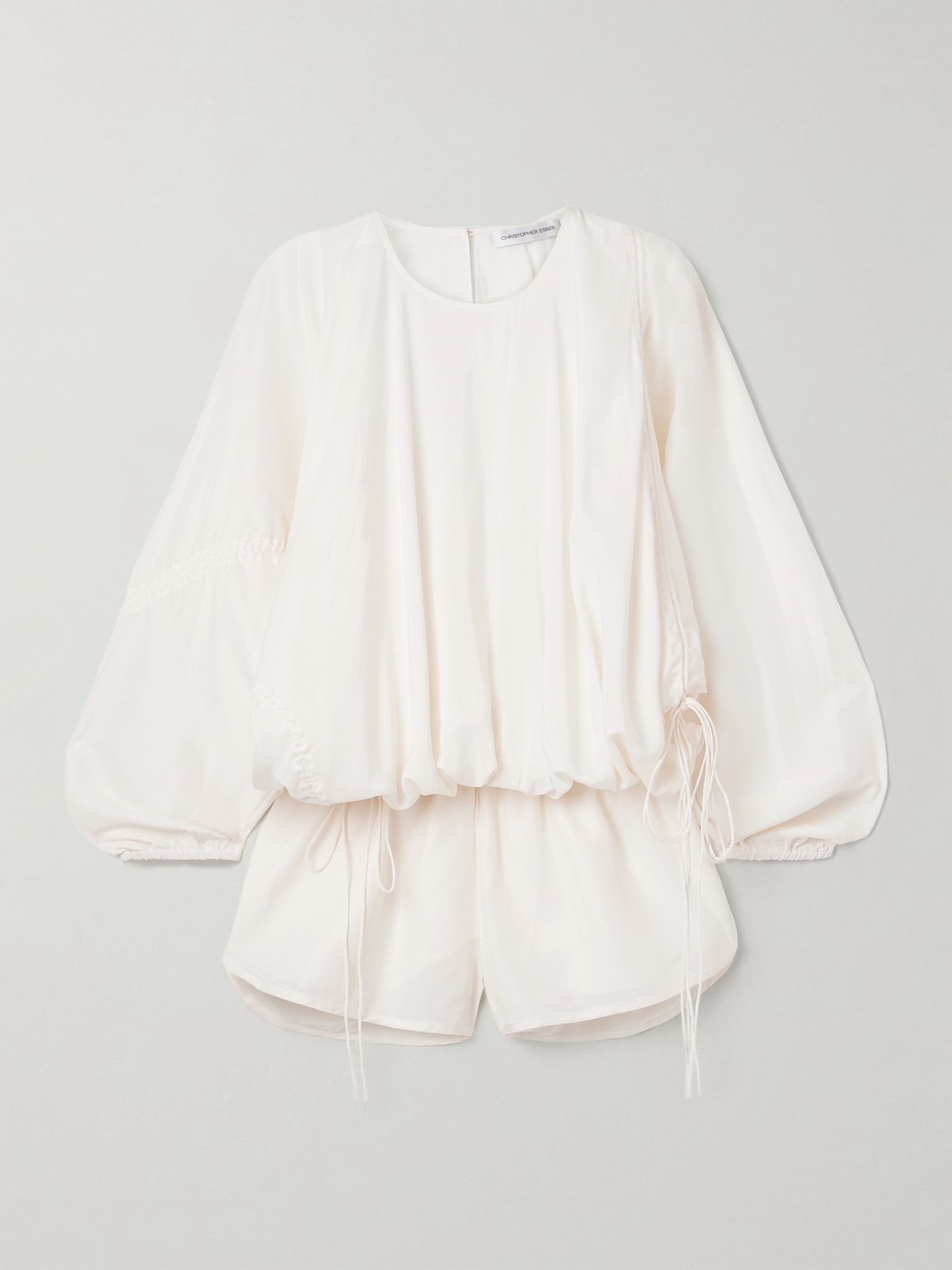 Christopher Esber's 'Parachute' playsuit is named for its loose shape, which is defined by adjustable drawstrings and an elasticated waistband. It's made from fluid silk and has a skin-baring keyhole at the back. Wear it with heels or flats, depending on the occasion. Size & Fit - Fits true to size, take your normal size - Designed for a loose fit - Drawstring waist, intended for a flexible fit - Lightweight, fluid, non-stretchy fabric - Model is 175cm/ 5'9" and is wearing a UK 8 Details & Care - Ivory silk - Button-fastening keyhole at back - 100% silk - Unlined - Dry clean