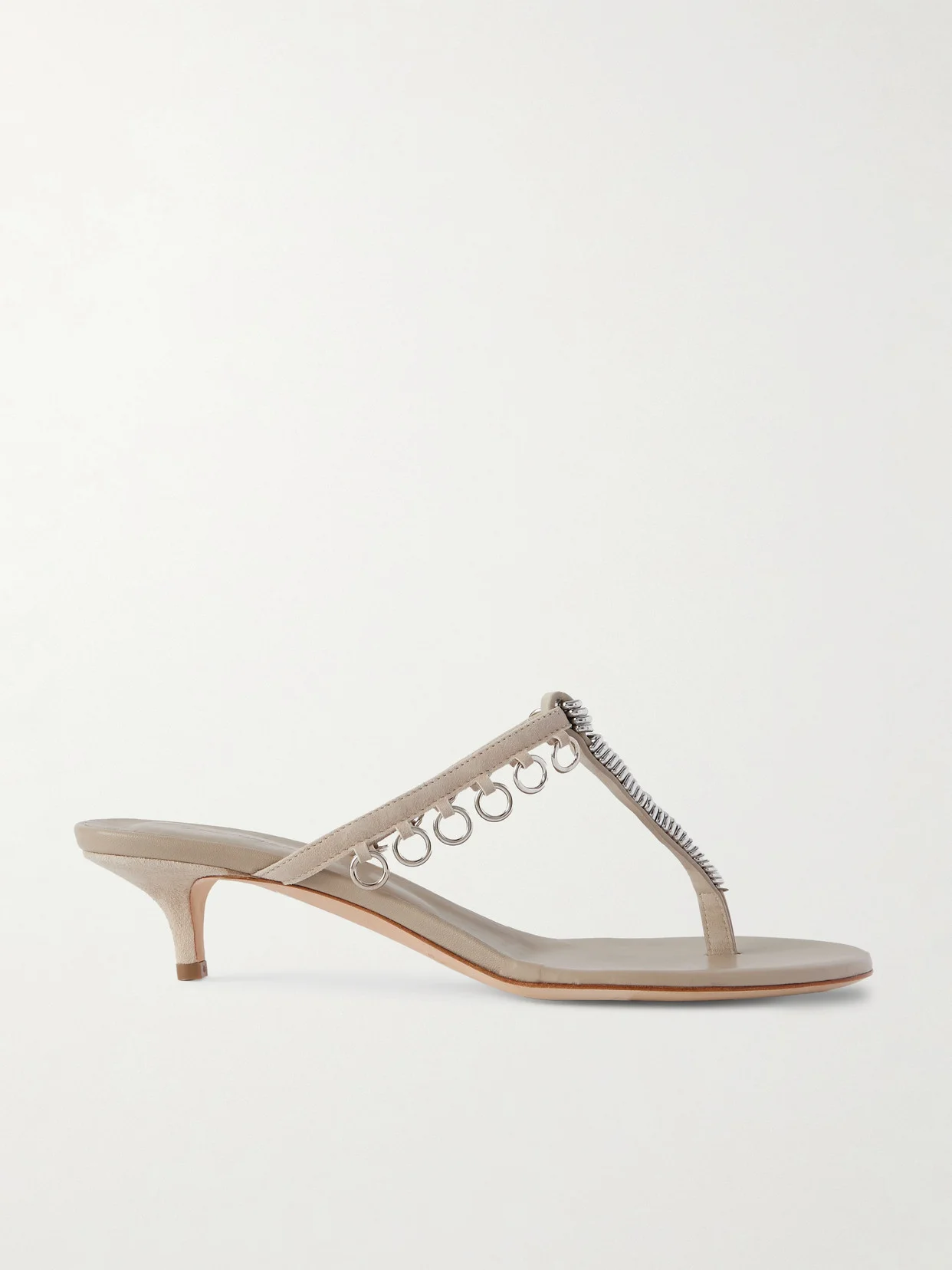 Christopher Esber's T-bar sandals are 'Pierced' with silver-tone rings that lay flat against the arch and are threaded through the center strap for a sculptural design. They're made from velvety suede that covers the kitten heel and have round toes.