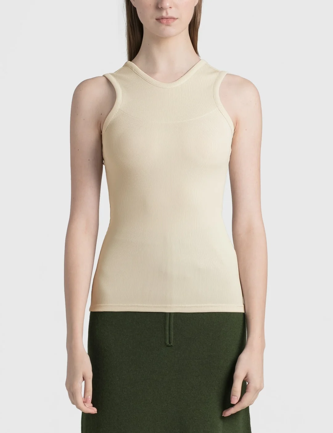 - Christopher Esber - Reversed Tank - Sleeveless - Rib-knit construction - Front and back reversed design - Scoop neckline at back - Ribbed trims - Color: Bone - Material: 93% Polyester, 7% Spandex - See more Tanks and Clothing SIZING - Model wears size 6 - Model measures: Height 181cm, Chest 33”/84cm, Waist 24”/61cm, Hip 35”/90cm