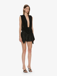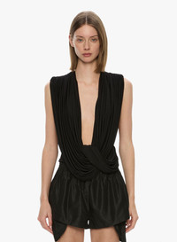 A study in fluid control, sheer jersey is draped and crossed to contour the body, falling into a soft plunge framed by gathered tension at the waist. The back releases into an open cowl, revealing a deliberate sliver of skin. Style with tailored trousers or relaxed denim to balance fluid lines. - Lightweight stretch jersey - Deep plunging neckline - Cross-over drape with gathered waist - Open cowl back detail - Pull-on style - Designed for a close fit - Main: 71% Rayon 29% Polyester Model is 180cm/5'11" and wears size AU 8 (US 4) AU sizing