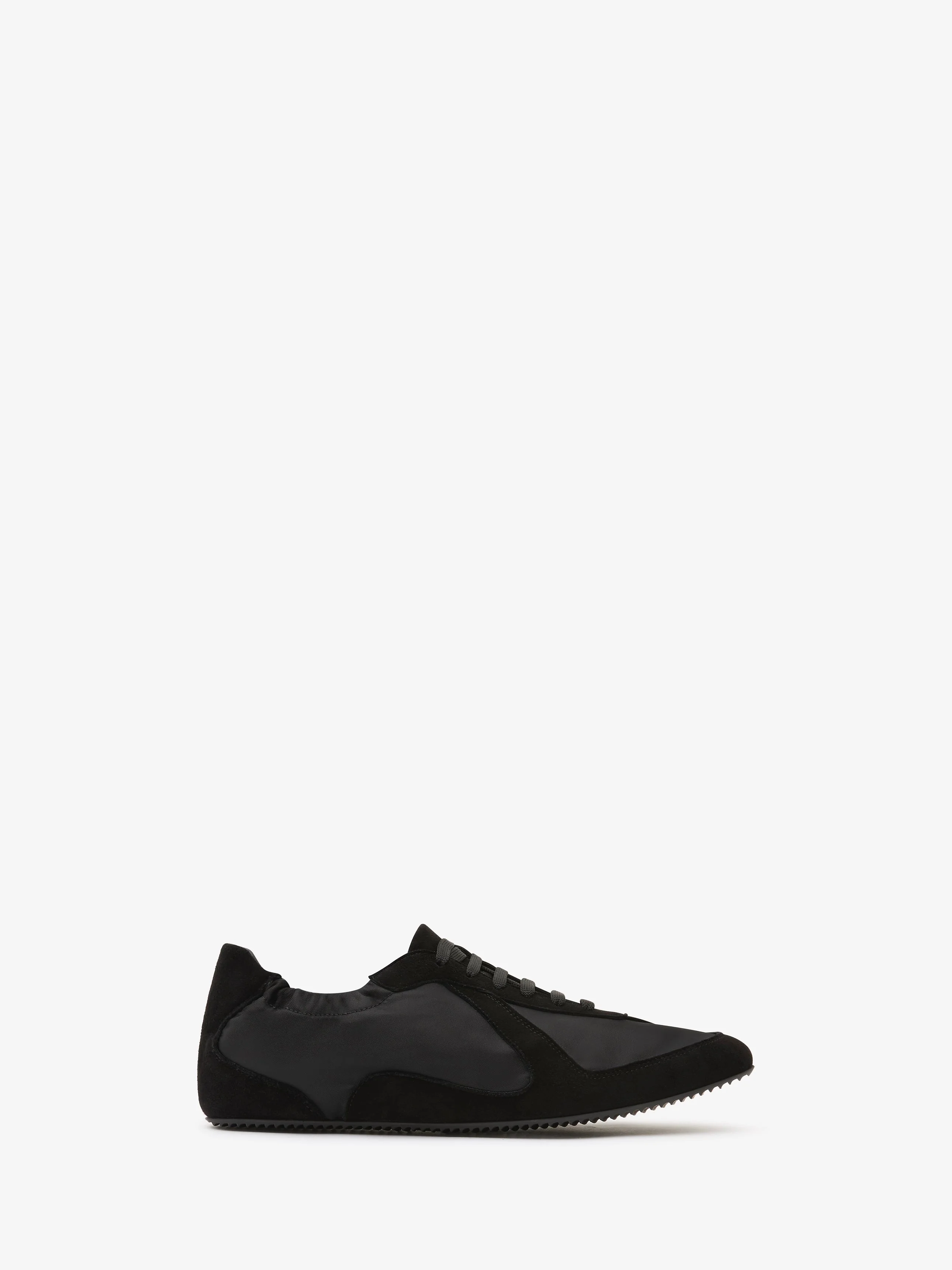 Constructed in matte satin with fluid suede overlays, the silhouette nods to vintage athletic forms, softened and contoured to the foot with an elasticated back and contrast sole. A study in tension between precision and ease. - Matte satin base with soft suede overlays - Low-profile sneaker silhouette with vintage sport references - Sculptural panel detailing for contrast and contour - Elasticated back for slip-on comfort - Main: 77% Viscose 28% Silk - Contrast: 100% 100% Lamb Nappa - Lining: 100% Nappa - Sole: 100% Rubber - Made in Italy Footwear is in IT sizing
