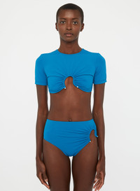 Sculptural crescent hardware pierces matte lycra for elevated poolside dressing. This cropped swim tee features front ruching and signature hardware. - Signature brass crescent hardware - High crew neckline - Short Sleeves - True to size with a close fit - Matte finish - Stretch lycra fabrication - Main: 72% Polyamide 28% Elastane, Hardware: 100% Brass Model is 180cm/5'11" and wears size AU 8 (US 4) AU sizing