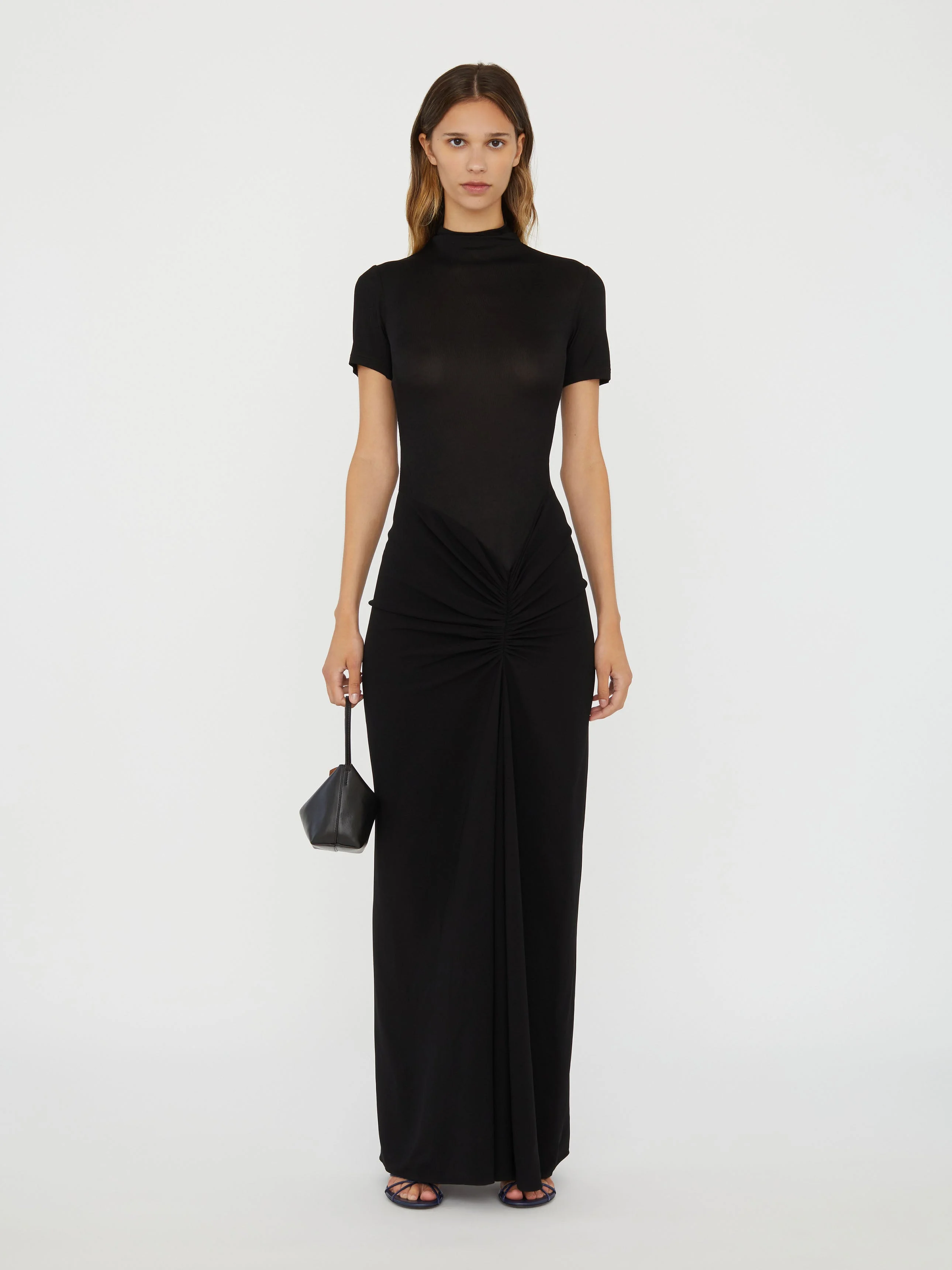 A ruched tee gown that features a sheer luxe rib short sleeve tee bodice, contradicted with a natural faille ruched maxi hem. - Sheer luxe ribbed bodice - Centre front skirt ruching - Short sleeves and high neckline - Centre front skirt ruching - Waterfall hem silhouette - Invisible back zip closure - True to size with slim fit - Bodice: 97% Viscose 3% Spandex, Skirt: 95% Viscose 5% Elastane Amelie is 180cm/5'11" and wears size AU 8 (US 4) AU sizing