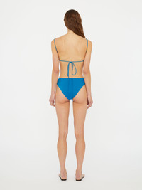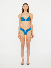 Sculptural orbit hardware pierces matte lycra for elevated poolside dressing. This wide band brief is cut high at the waist and ruched at the centre. - Signature brass orb hardware - Ruched at centre front - High rise brief - True to size with a close fit - Matte finish - Stretch lycra fabrication - Main: 72% Polyamide 28% Elastane, Hardware: 100% Brass Claire is 179cm/5'10.5" and wears size AU 8 (US 4) AU sizing