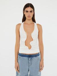 A Christopher Esber signature is reimagined into a tank silhouette. Crafted from dry jersey, this ruched tank is artfully constructed with a sculptured wire cut-out and bespoke copper hardware. - Sculpted wire wave formation hardware - Tank silhouette - Pull over style - True to size - Main: 100% Viscose - Hardware: Copper Model is 180cm/5'11" and wears size AU 8 (US 4) AU sizing