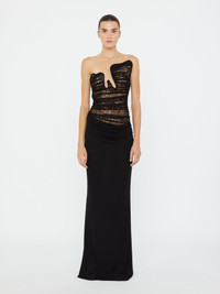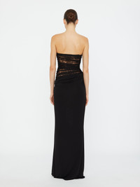 A strapless evening gown featuring a sculptural lace bodice, traced with an organic neckline and sheer paneling. The bodice is reinforced with internal structure and framed by delicate copper wiring, while a gathered hip seam releases into a fluid, floor-length skirt. Both directional and refined, the silhouette fuses softness with architectural control. Style with tonal heels and sculptural jewellery for after-dark clarity. - Strapless gown with sculptural lace bodice - Sheer lace paneling with internal corset structure - Organic neckline with custom copper wiring - Draped hip detailing into a column skirt - Invisible zip closure at side - Bodice: 37% Viscose, 40% Polyamide, 23% Elastane - Skirt: 100% Viscose - Lining: 100% Silk - Hardware: 100% Copper - Dry Clean Only Model is 180cm/5'11" and wears size AU 8 (US 4) AU sizing