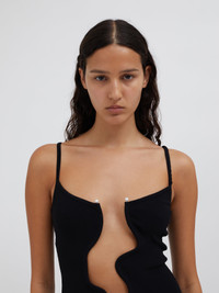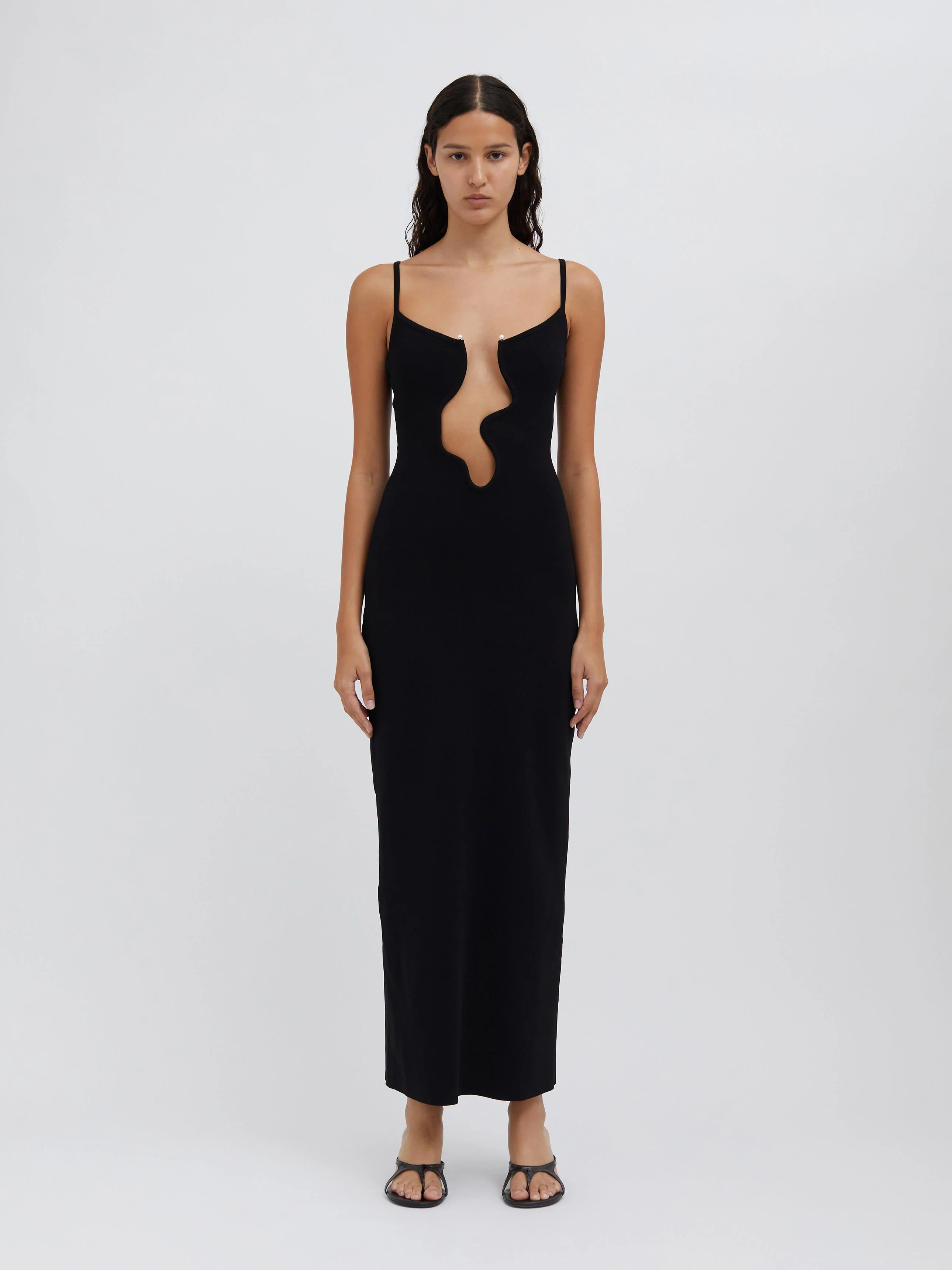 - 80% Viscose 20% Nylon with 100% Zinc Alloy Hardware - Stretch luxe compact rib - Hand crafted hardware - Sculpture wave cutout across torso - Full length silhouette - Pull over style - True to size - Dry clean only Scarlett wears a size 8 Aus Height 175cm/5”8.5”