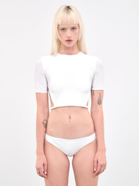 CHRISTOPHER ESBER swim top in white, baby tee design, luxe matte stretch fabric, beaded detailing, round neck, short sleeves, open back, dual self-ties, cropped, fitted. UK Sizing 72% Polyamide, 28% Elastane Model is 5'8" wearing size 6. Bust: 30" Waist: 24.5" Hips: 34"