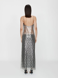 A slip silhouette suspended from fine straps, cut in sequined lace for liquid shimmer. The sheer composition drapes the body with deliberate lightness, balancing structure with ease. Defined by a low back, the dress embraces both transparency and texture. Style with pared-back heels for evening minimalism. - Full-length slip dress in sequinned lace - Sheer composition with floral motif - Slim straps and low back neckline - Straight cut with fluid drape - Main: 63% PLF, 25% PL, 12% PLM - Lining: 100% Silk - Dry Clean Only Model is 179cm/5'10.5" and wears size AU 8 (US 4) AU sizing