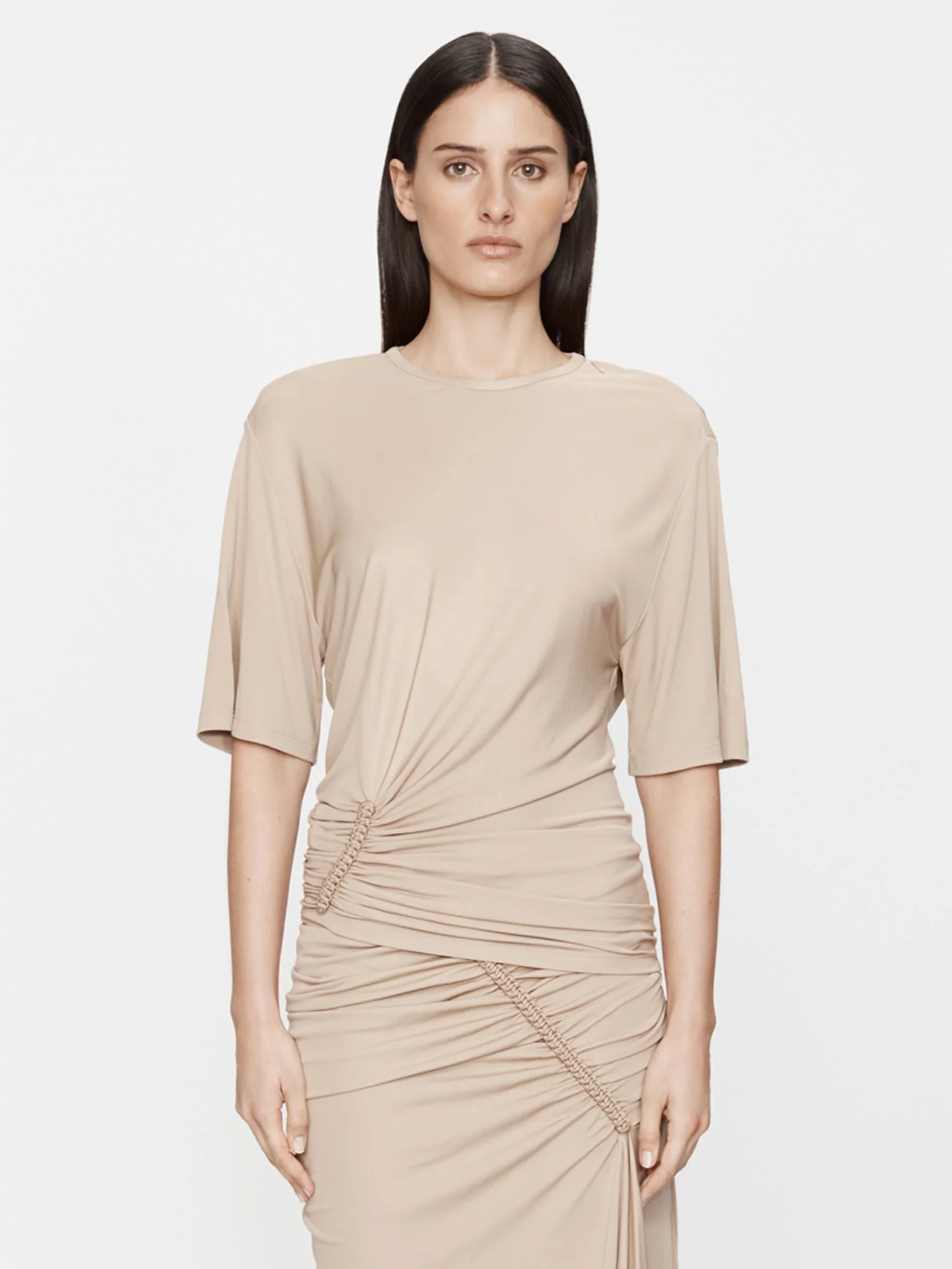 Cut in a draped technical jersey, the silhouette is cinched at the side with tonal shibari, forming soft ruching through the waist. The Shibari Side Ruched Tee reinterprets the classic T-shirt with considered detail. - Crafted from lightweight technical jersey - Intricate Shibari detail at the side - Gathered waist for a sculpted effect - Relaxed crew neckline and drop shoulder - Main: 100% Viscose Model is 180cm/5'11" and wears size AU 8 (US 4) AU sizing