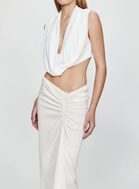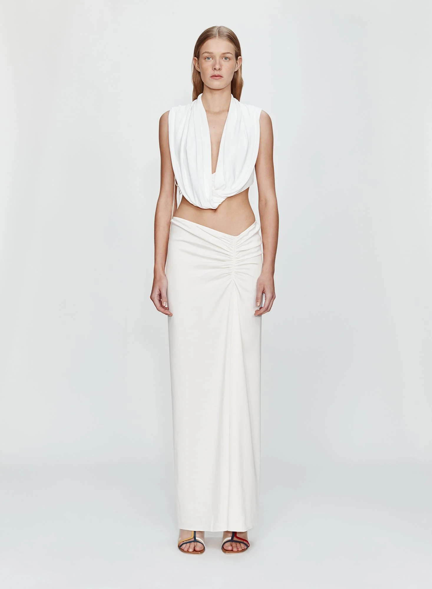 Cut in a fluid, heavyweight jersey, the Side Ruched Skirt is defined by gathered draping that angles across the hip before falling into a clean, column silhouette. Designed to sit low on the waist, the shape creates a soft diagonal line through the body, balancing structure with ease. Style with the Interlock Jersey Drape Top for an elevated monochrome set. - Low-waist maxi silhouette - Asymmetric ruched detailing through the hip - Straight column skirt with soft drape - Pull-on construction - True to size - Main: 95% Viscose, 5% Elastane Model is 180cm/5'11" and wears size AU 8 (US 4) AU sizing