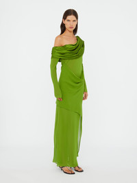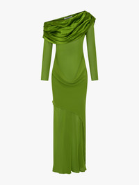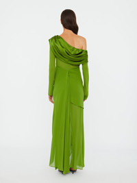 Blending structure and sensuality, sheer silk georgette is intentionally draped across the shoulders and hip, with a layered train at the back which appears to fall away from the body. - Long sleeve maxi silhouette - Ruching at shoulder & hips - Washed Silk Georgette - Unlined - Sheer torso - True to size - 100% Silk Model is 180cm/5'11" and wears size AU 8 (US 4) AU sizing