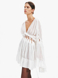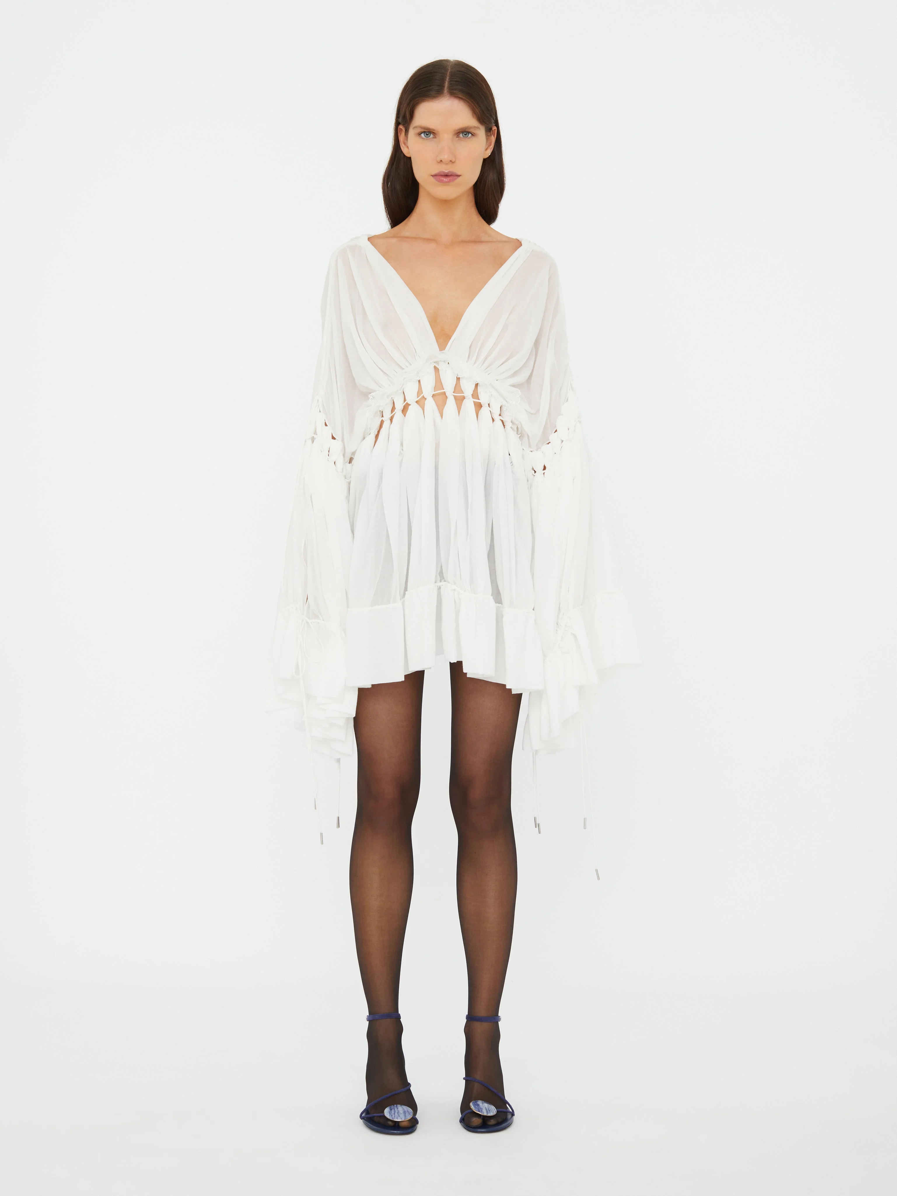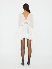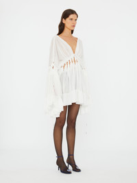 A voluminous mini dress crafted in sheer cotton muslin, detailed with twisted fringe through the waist and sleeves. Designed with a deep V neckline and gathered drape, the silhouette floats around the body - balancing lightness with intricate construction. Style with bare legs and heels or layer over swim for elevated resort wear. - Voluminous mini dress in sheer cotton muslin - Deep V neckline with gathered front - Twisted fringe detail at waist and sleeve seams - Full sleeves with drawcord cuffs - Ruffled hemline with asymmetric volume - Unlined - Main: 55% Cotton, 45% Viscose - Dry Clean Only Model is 180cm/5'11" and wears size AU 8 (US 4) AU sizing