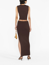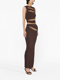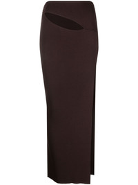 slash-detail maxi skirt Modern cut-out detailing and structured understated silhouettes define Christopher Esber's aesthetic. Presented in a mahogany shade, this skirt has the label's signature cut-outs on the waist. Highlights - Mahogany - Cut-out detailing - Side slit - Elasticated waistband Imported Composition Viscose 65%, Nylon 35% SIZE & FIT Model measurements Height 5 ft 10 in(1.78 m) Bust/Chest 29.92 in(76 cm) Hips 34.64 in(88 cm) Waist 23.62 in(60 cm) Measurement WAIST 19.68 in(50 cm) FittingInformation Made with a midweight knit, this piece offers some stretch This piece fits true to size – take your usual size Washing instructions Dry Clean Only