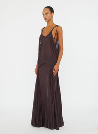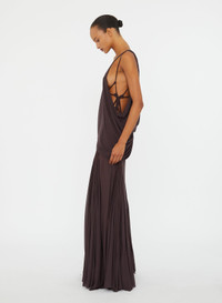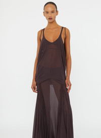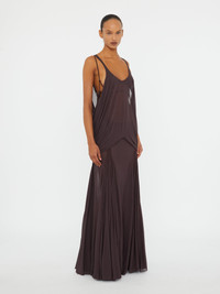 A fluid tank gown suspended from fine straps, anchored with macrame knots at the side seams. Draped jersey falls into a floor-length silhouette, cut sheer to reveal the body in soft, deliberate layers. A study in suspension and flow, realised with sculptural ease. Style with minimal sandals and sculptural jewellery for evening refinement. - Floor-length draped jersey tank dress - Sheer layered construction with fluid drape - Side macrame knot detailing with cascading ties - Double strap shoulder design - Pull-on style with open sides - 100% Viscose Model is 179cm/5'10.5" and wears size AU 8 (US 4) AU sizing