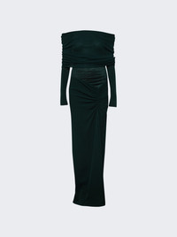 Details - Fitted silhouette - Off the shoulder - Long sleeve - Maxi length - Invisible zip closure - Sheer design - Rib bodice - Ruched design - Care according to label - Material: 97% VISCOSE 3% SPANDEX, 95% VISCOSE 5% ELASTANE, 100% SILK - Model is 5'9"/175cm and is wearing a size AU8 Brand Style: 24043219 Designer/Brand: CHRISTOPHER ESBER