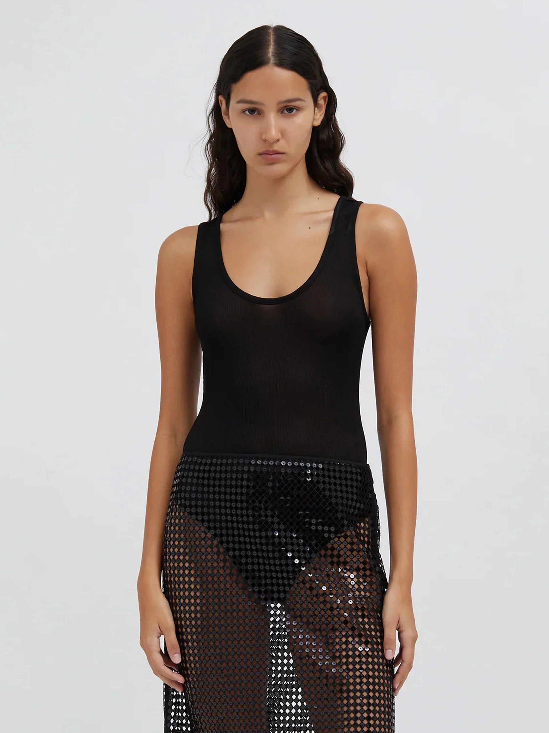 odel:Lau - 95% Viscose 5% Elastane - Sheer rib - Scoop neckline - Slim fit - True to size - Dry clean only Lauren is 178cm/5'10.5” & wears size AU 8 (US 4) AU sizing