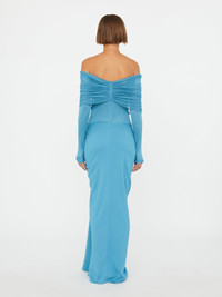 Crafted in soft stretch jersey and defined by an off-shoulder neckline with layered ruching. A sheer mesh bodice contrasts with the gathered skirt, ruched at the hip. Fitted sleeves extend past the wrist. - Off-shoulder neckline with layered ruching - Column maxi silhouette - Sheer mesh bodice - Ruching detail at hip - Extended fitted sleeves - Main: 97% Viscose 3% Elastane - Mesh: 100% Silk - Dry Clean Only Model is 180cm/5'11" and wears size AU 8 (US 4) AU sizing