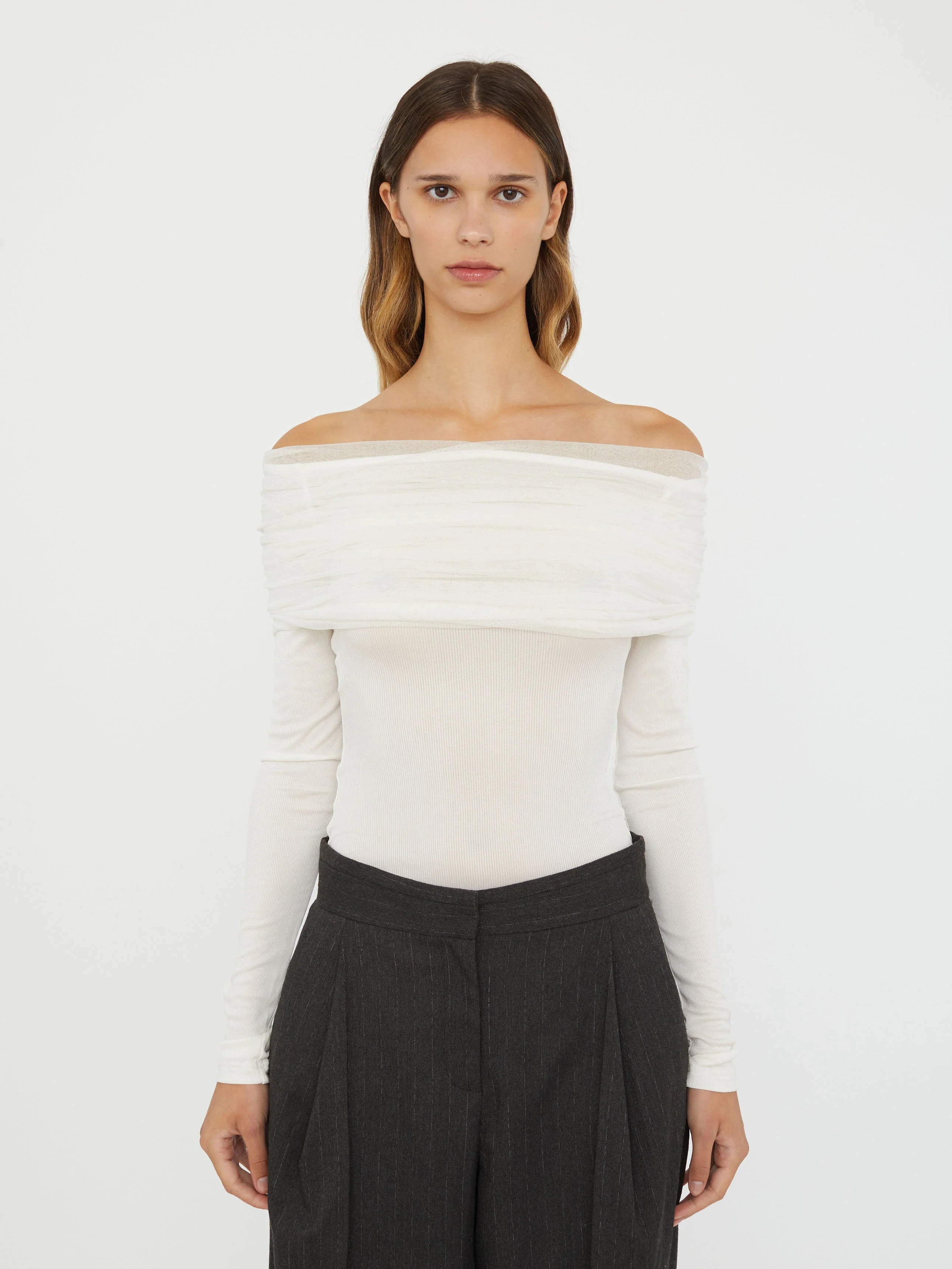 Evolved from the brands signature Veiled Top. This ribbed off the shoulder long sleeve top is wrapped in a sheath of transparent silk tulle. - Sheer stretch silk tulle - Lightweight ribbed base - Fold down shawl for multi wear - Off the shoulder - True to size - Main: 97% Viscose 3% Elastane - Outer Veil: 100% Silk Lucianne is 177cm/5'9” & wears size AU 6 (US 2) AU sizing