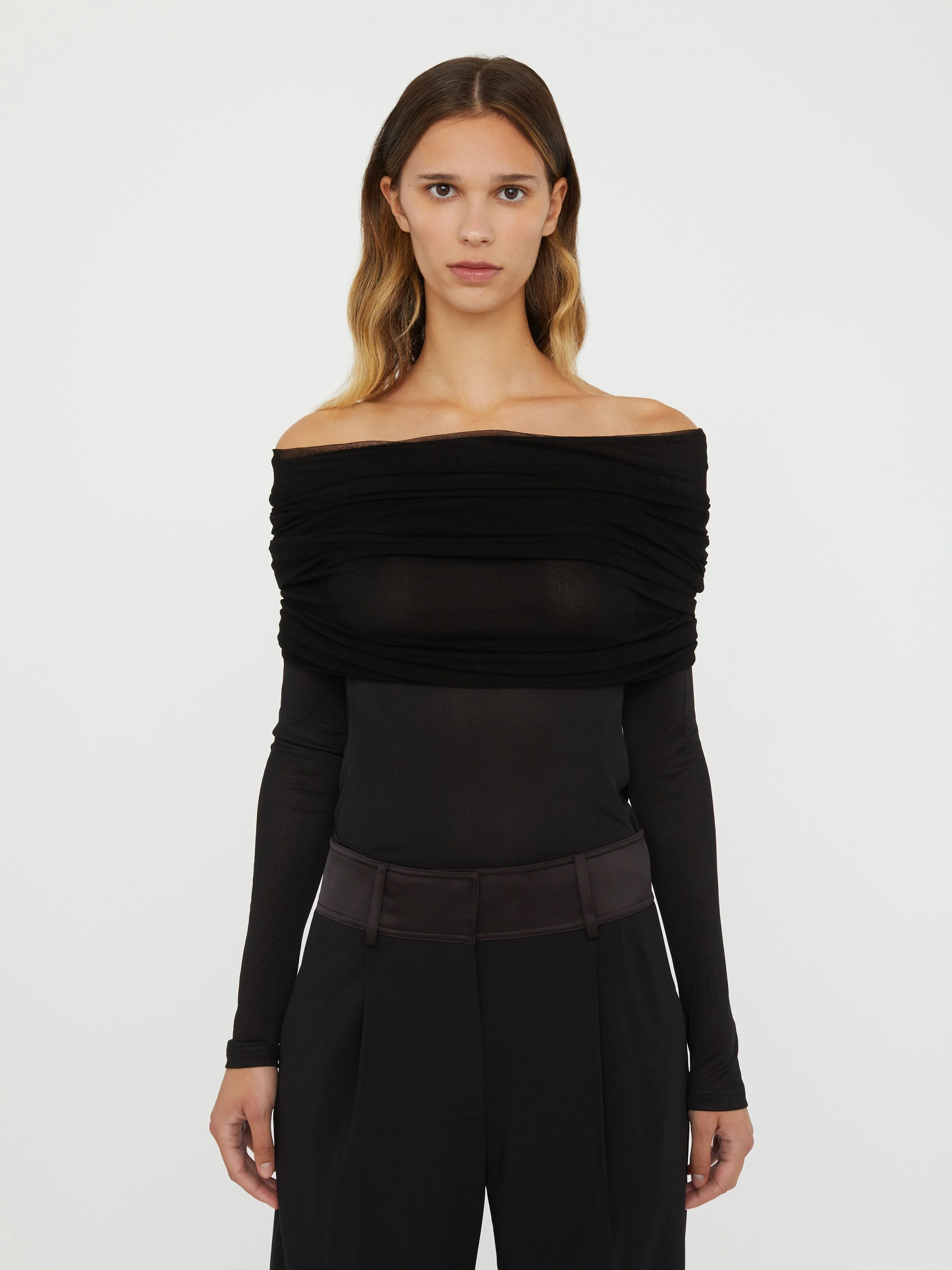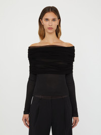 Evolved from the brands signature Veiled Top. This ribbed off the shoulder long sleeve top is wrapped in a sheath of transparent silk tulle. - Sheer stretch silk tulle - Lightweight ribbed base - Fold down shawl for multi wear - Off the shoulder - True to size - Main: 97% Viscose 3% Elastane - Outer Veil: 100% Silk Sarah is 175cm/5'8.5” & wears size AU 8 (US 4) AU sizing