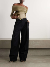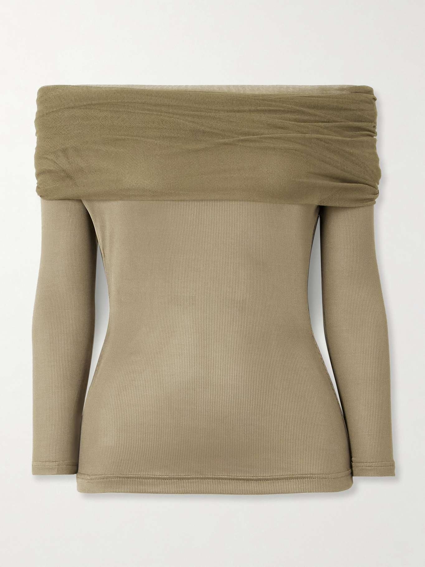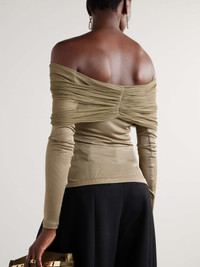EDITORS'NOTES A signature of Christopher Esber's collections, the 'Veiled' top is a perfect embodiment of the designer's fluid, modern aesthetic. It's made from ribbed jersey and has a silk-tulle overlay that's gently gathered along the off-the-shoulder neckline - you can easily adjust it to create your preferred look. SIZE & FIT Model measurements: - Fits true to size, take your normal size - Those with a large bust may wish to take the next size up - Intended for a very close fit - Lightweight, stretchy fabric - Model is 177cm/ 5'10" and is wearing a UK 8 - Bust: 79cm/ 31" - Waist: 61cm/ 24" - Hip: 89cm/ 35" DETAILS & CARE - Army-green jersey and silk-tulle - Slips on - 97% viscose, 3% spandex; trim: 100% silk - Dry clean - Designer color: Linseed