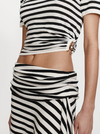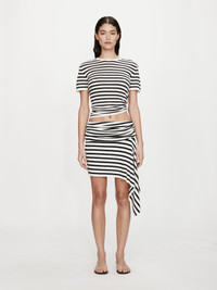 The Stripe Knit Ruched Orbit Tee is crafted from a soft ribbed knit featuring black and white stripe. Designed with a relaxed fit through the body, it gathers at the hip through ruched detailing and signature brass orbit hardware - creating a subtle twist on a classic silhouette. Style with the coordinating Stripe Knit Extension Skirt or tailored separates for a refined off-duty look. - Crew neckline - Short sleeves - Ruched detailing with signature orbit hardware - Soft ribbed knit fabrication - Pull-on style - Main: 90% Viscose, 10% Nylon Model is 180cm/5'11" and wears size AU 8 (US 4) AU sizing