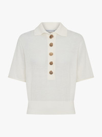 A relaxed polo silhouette crafted in a textured chalky knit, finished with contrast rib trim at the sleeves and hem. Shells delicately frame the placket as an elevated nod to coastal nostalgia. Soft structure and natural drape offer ease of wear. Designed for coordinated or off-duty styling - Relaxed polo silhouette - Contrast rib trim at sleeves and hem - Spiral shell buttons on front placket - Soft drape with light structure - Main: 75% Cotton 25% Nylon - Hardware: Shell Trim Model is 180cm/5'11" and wears size AU 8 (US 4) AU sizing