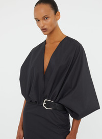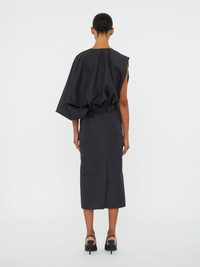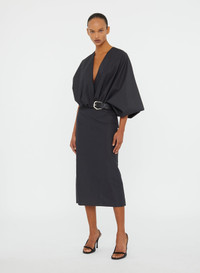 A sculptural midi dress cut in crisp taffeta, defined by a deep plunge neckline and asymmetric swaddled sleeve. Anchored with a wide belt at the waist, the silhouette contrasts volume with sharp linearity. Precise, architectural, and minimal in its form. Style with refined heels and minimal jewellery for evening restraint. - Midi length silhouette - Deep plunge neckline - Asymmetric draped sleeve detail - Wide belt with sculptural buckle - Fitted straight skirt silhouette - Main: 53% Polyamide 47% Cotton - Contrast" 100% Cow Leather Belt - Dry Clean Only Model is 179cm/5'10.5" and wears size AU 8 (US 4) AU sizing