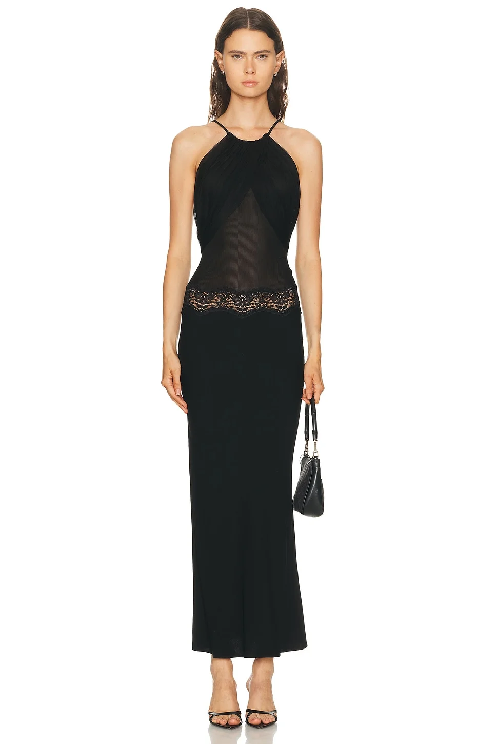 Details - Self: 97% viscose, 3% elastane - Lining: 100% silk - Contrast Fabric 1: 95% viscose, 5% elastane - Contrast Fabric 2: 65% polyamide, 20% polyester, 15% elastane - Dry clean only - Partially lined at bust - Hidden back zip closure - Draped detailing at bust - Lace waistband design - Midweight jersey fabric with crepe skirt - Made in Vietnam - Our Style No. CHRF-WD339 - Manufacturer Style No. 25043857