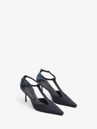 Crafted in silk satin with a refined, architectural silhouette. A pointed toe elongates the foot, while the delicate T-strap and curved heel add an elevated sense of proportion. Secured by a slim ankle strap with buckle closure, the design merges soft structure with evening precision. - Velvet-finish satin upper - Pointed toe with T-bar strap detailing - Adjustable ankle strap with buckle fastening - Curved stiletto heel - Leather sole and lining - Main: 77% Viscose 28% Silk with Lamb Napper Upper - Lining: 100% Nappa Leather - Sole: 100% Cow Leather - Made in Italy Footwear is in IT sizing