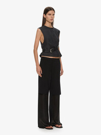 A tailored trouser defined by a layered silhouette - structured wool suiting cut over fluid satin flares. Designed with sharp lines and elongated length, the contrast in fabrications creates precise balance between structure and ease. Style with sculptural tops or sharp tailoring for directional intent. - Tailored trouser with layered split-level silhouette - Structured wool suiting short overlay with satin under-layer - High-rise waist with concealed closure - Elongated length through leg - Slim fit through waist with fluid lower panel - Main: 96% Wool, 4% Elastane - Contrast 1: 100% Viscose - Contrast 2: 75% Acetate, 25% Polyester Model is 180cm/5’11” and wears size AU 8 (US 4) AU sizing