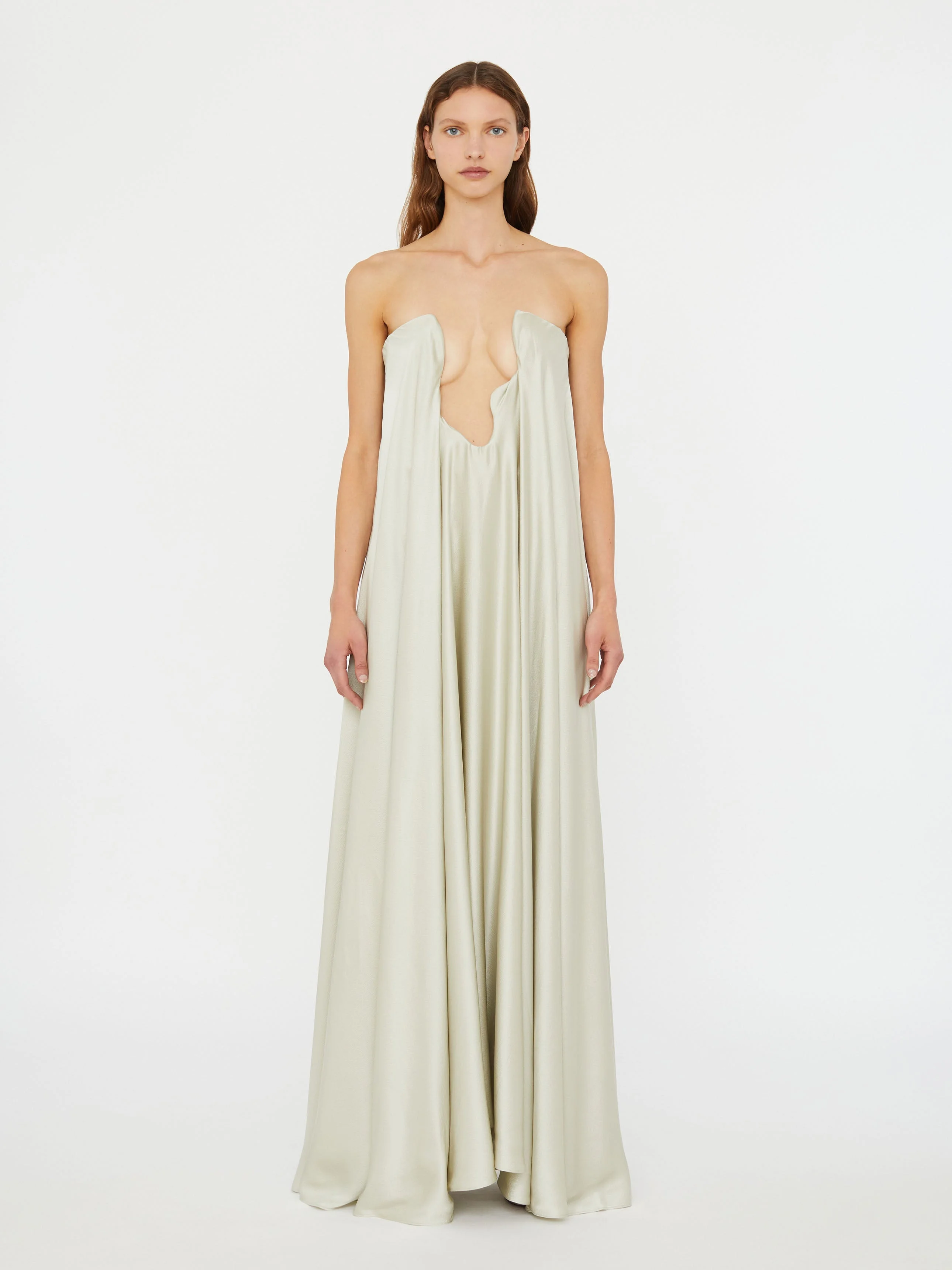 Evolved from the brands signature salacia, sculptural hardware anchors a plunging neckline in this strapless gown. Finished with a generously volumed hammered silk hem. - Signature salacia hardware - Plunging neckline - Maxi silhouette - Volumed hem - Invisible back zipper - True to size - 100% Viscose - Hardware: 100% Zinc Alloy Claire is 179cm/5'10.5" and wears size AU 8 (US 4) AU sizing