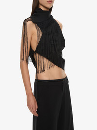 An asymmetrical wrap top cut in matte crepe, defined by hand-knotted macrame with cascading fringe. Draped diagonally across the body, the silhouette balances softness with architectural edge, anchored by fine strap detailing. Style with tailored trousers or layered skirts for sculptural contrast. - Asymmetrical wrap top in matte crepe - Hand-knotted macrame detail with long fringe - Draped construction with diagonal hem - Slim shoulder strap with open side cut-outs - Concealed side fastening - Main: 96% Virgin Wool, 4% Elastane - Contrast: 100% Viscose Model is 180cm/5’11” and wears size AU 8 (US 4) AU sizing