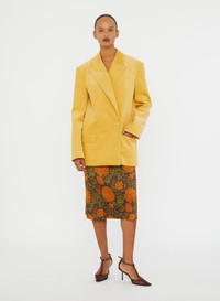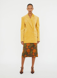 Crafted from a heavyweight jacquard with raised yarnwork, woven in a bold Brocade motif. Featuring raw hem edges and a mid-length cut, balancing graphic texture with understated shape. Designed to ground knitwear or tailoring with seasonal depth. Fall Winter 2025 Runway Look 07 - Mid-length straight skirt - Textured jacquard base with woven floral motif - Cut in warm tonal contrast - Raw edge hem detailing - Main: 100% Viscose Model is 179cm/5'10.5" and wears size AU 8 (US 4) AU sizing