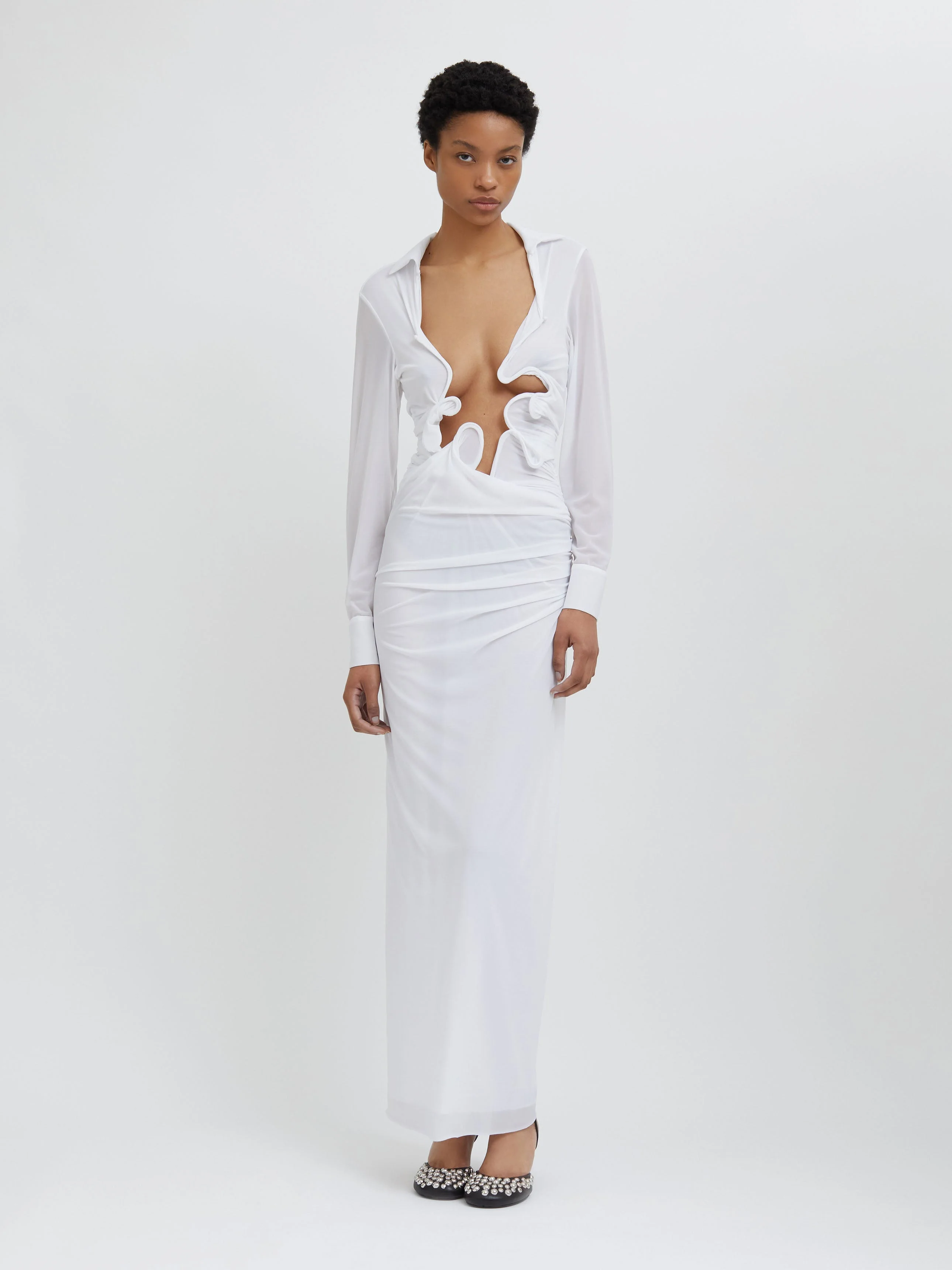 - 90% Nylon 10% Lycra with Brass hardware - Smooth, mesh fabrication - Hand crafted hardware - Sculpture wave cutout across torso - Sleeve cuffs - Invisible zip - Dry clean only - True to size Scarlett wears a size 8 Aus Height 175cm/5'8.5”
