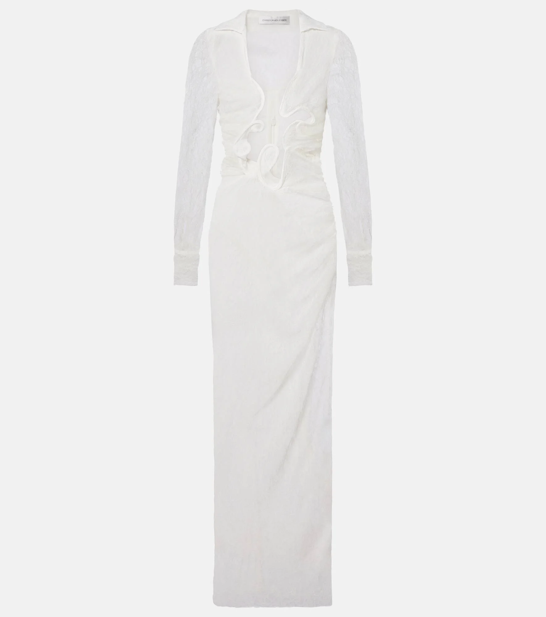 Christopher Esber's sensual cuts and sculptural hardware make for a contemporary twist on minimalism. Carefully crafted from sheer lace, the Venus gown is a long-sleeved style characterized by its structured, asymmetrical neckline. Product Details - Material: 40% polyamide, 37% viscose, 23% elastane - Care instructions: dry clean - Made in Vietnam - Color: white - Designer color name: White - Lining: 100% silk - Closure: concealed zipped back - Details: 100% copper - Item number: P01132819 Size & Fit - True to size - Sheer - Fitted - Slightly stretchy fabric - The model seen in the picture is 178cm-5'10" and wearing a size UK 6