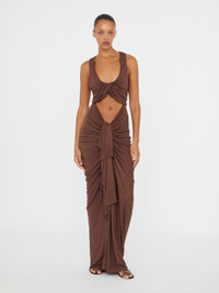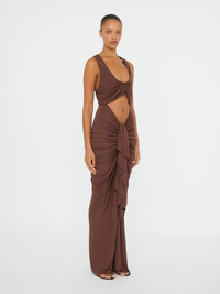 A Christopher Esber signature silhouette is reimagined in an energetic Cacao.¬† This sleeveless draped jersey maxi gown is artfully constructed with an exposed midriff and cascading draped panel. Refined by a plunging neckline and signature cut-out accents. - Plunging neckline - Sleeveless ruched maxi gown - Cascading front draping - Exposed midriff - Slim column fit - Invisible back zip - True to size - 100% Viscose Am√©lie is 180cm/511‚Au and wears size AU 8 (US 4) AU sizing