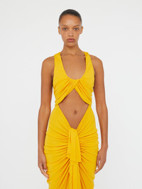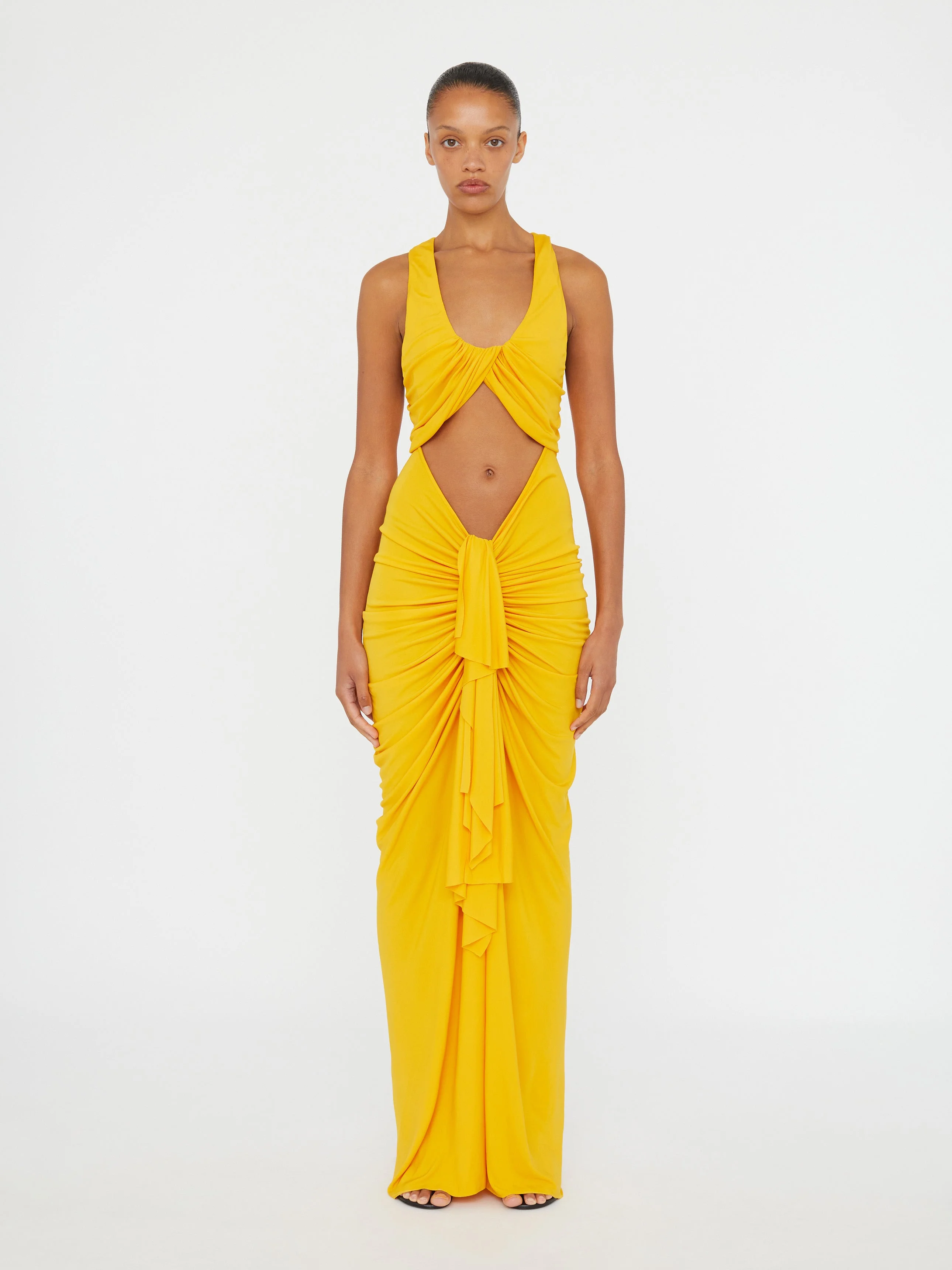 A Christopher Esber signature silhouette is reimagined in an energetic Saffron.¬† This sleeveless draped jersey maxi gown is artfully constructed with an exposed midriff and cascading draped panel. Refined by a plunging neckline and signature cut-out accents. - Plunging neckline - Sleeveless ruched maxi gown - Cascading front draping - Exposed midriff - Slim column fit - Invisible back zip - True to size - 100% Viscose Am√©lie is 180cm/511‚Au and wears size AU 8 (US 4) AU sizing