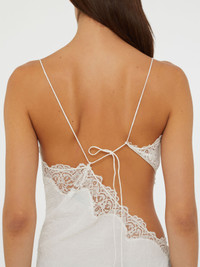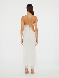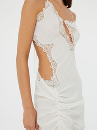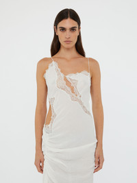 A dialogue between textures unfolds in crinkled crepe and sheer lace. Signature cut-out apertures are carved through the body, traced by lace panel inserts that reveal and conceal in measured balance. Finished with a gathered front detail. - Crinkled crepe with Lace trim - Signature Christopher Esber cut out details - Gathered detailing - Midi length - Adjustable tie fastening - True to size - Main: 100% Viscose - Lace: 65% Polyamide 20% Polyester 15% Elastane - Dry clean only Claire is 179cm/5'10.5" and wears size AU 8 (US 4) AU sizing