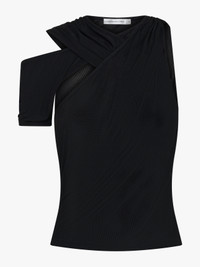 A sculpted tee in slinky viscose jersey, designed with asymmetric draping and directional cut-outs. The neckline twists across the chest, revealing one shoulder and framing the body in gathered tension. Fitted through the waist with natural stretch and fluid movement. Pair with low-rise tailoring or lace for a modern, deconstructed look. - Fitted tee in slinky jersey - Asymmetric cut-out and twist-front neckline - Single sleeve with exposed shoulder - Soft gathers at waist for sculpted fit - Pull-on style - Unlined - 95% Viscose, 5% Elastane Model is 180cm/5'11" and wears size AU 8 (US 4) AU sizing