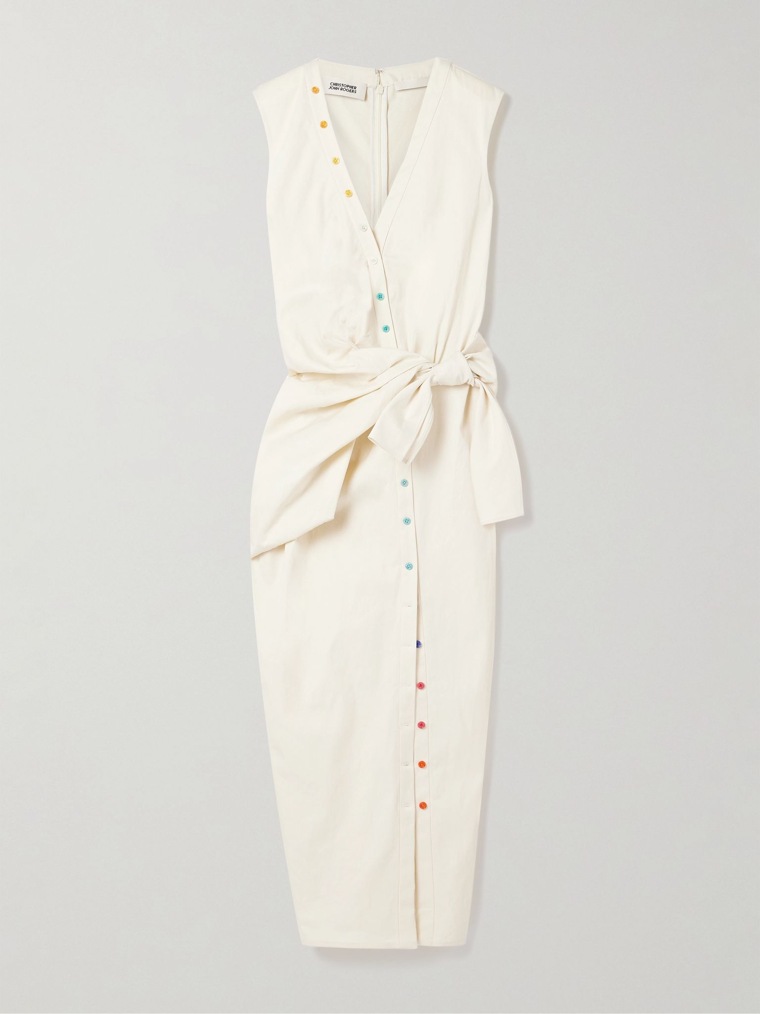 Christopher John Rogers is known for his affinity for color - on this dress, it's showcased subtly in the rainbow buttons that trace from the shoulder through the midi hem. It's made from cotton-twill and has draped ties that knot at the front. Size & Fit - Fits true to size, take your normal size - Intended for a slim fit - Lightweight, non-stretchy fabric - Model is 175cm/ 5'9" and is wearing a US 2 Details & Care - Ecru washed cotton-twill - Ties at side, concealed hook and zip fastening at back - 100% cotton - Dry clean - Designer color: Macadamia