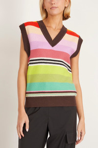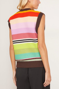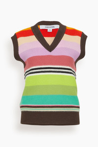 The Christopher John Rogers Pique Stitch Striped Vest is crafted in their signature vibrant rainbow hues. You'll love the classic, straight silhouette of this sweater vest with a v-neckline. Wear yours with jeans and flats. FIT DESCRIPTION MODEL MEASUREMENTS - Fits true to size, take your normal size - Sweater vest - Straight silhouette - Pique knit - V-neckline - Ribbed trim - 90% wool, 8% viscose, 2% elastane. - Harriet is wearing a size XS - Bust: 32" - Waist: 24" - Hips: 30.5" - Height: 5’8.5”