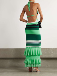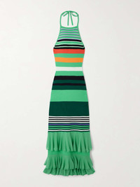 EDITORS'NOTES Christopher John Rogers' use of color and pattern is uplifting and joyful. Knitted with a rainbow of stripes, this dress fits slim and has a halterneck and an adjustable strap that runs across the open back. Elevate the tiered, ruffled maxi hem with heels. SIZE & FIT Model measurements: - Fits true to size, take your normal size - Designed for a slim fit - Mid-weight, stretchy fabric - Model is 177cm/ 5'10" and is wearing a size Small - Bust: 86cm/ 34" - Waist: 65cm/ 25.5" - Hip: 90cm/ 35.5 DETAILS & CARE - Multicolored stretch-knit - Ties at neck - 72% viscose, 15% elastane, 9% cotton, 4% nylon - Dry clean - Designer color: Arsenic