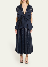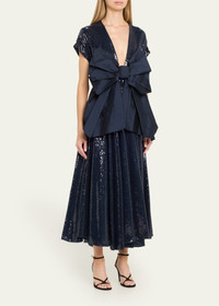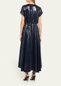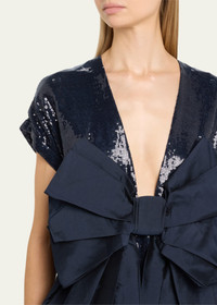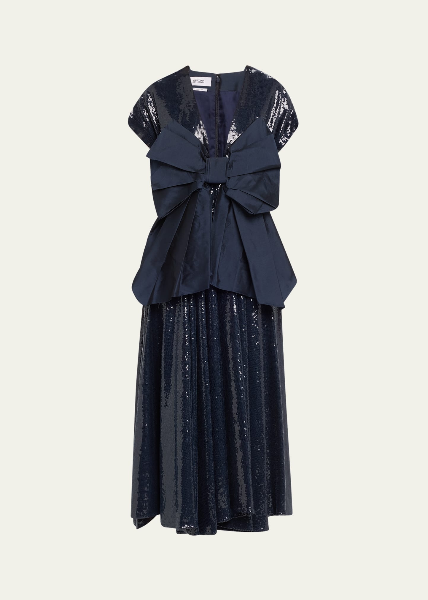 CHRISTOPHER JOHN ROGERS sequin-embellished dress with a crushed bow V neckline Short sleeves A-line silhouette Full length Back zip Viscose/linen/silk Made in USA Model is 5'10"/177cm. Online Inquiries: BGS21_B9JW6| Store Inquiries: #4887045