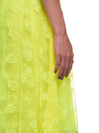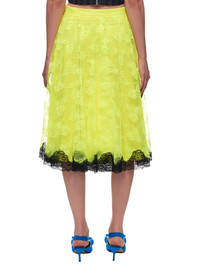 Christopher Kane chantilly lace neon midi skirt in yellow, all over embroidered/stitched lace fabric detailing, adjustable waist with side zippered closure, inner fabric doublure, straight hem with lace trim detailing, tonal stitching. Made in the United Kingdom. Composition - 100% Polyester Model is 5ft 8” and wearing a size 40. Bust: 32” Waist: 26” Hip: 36"