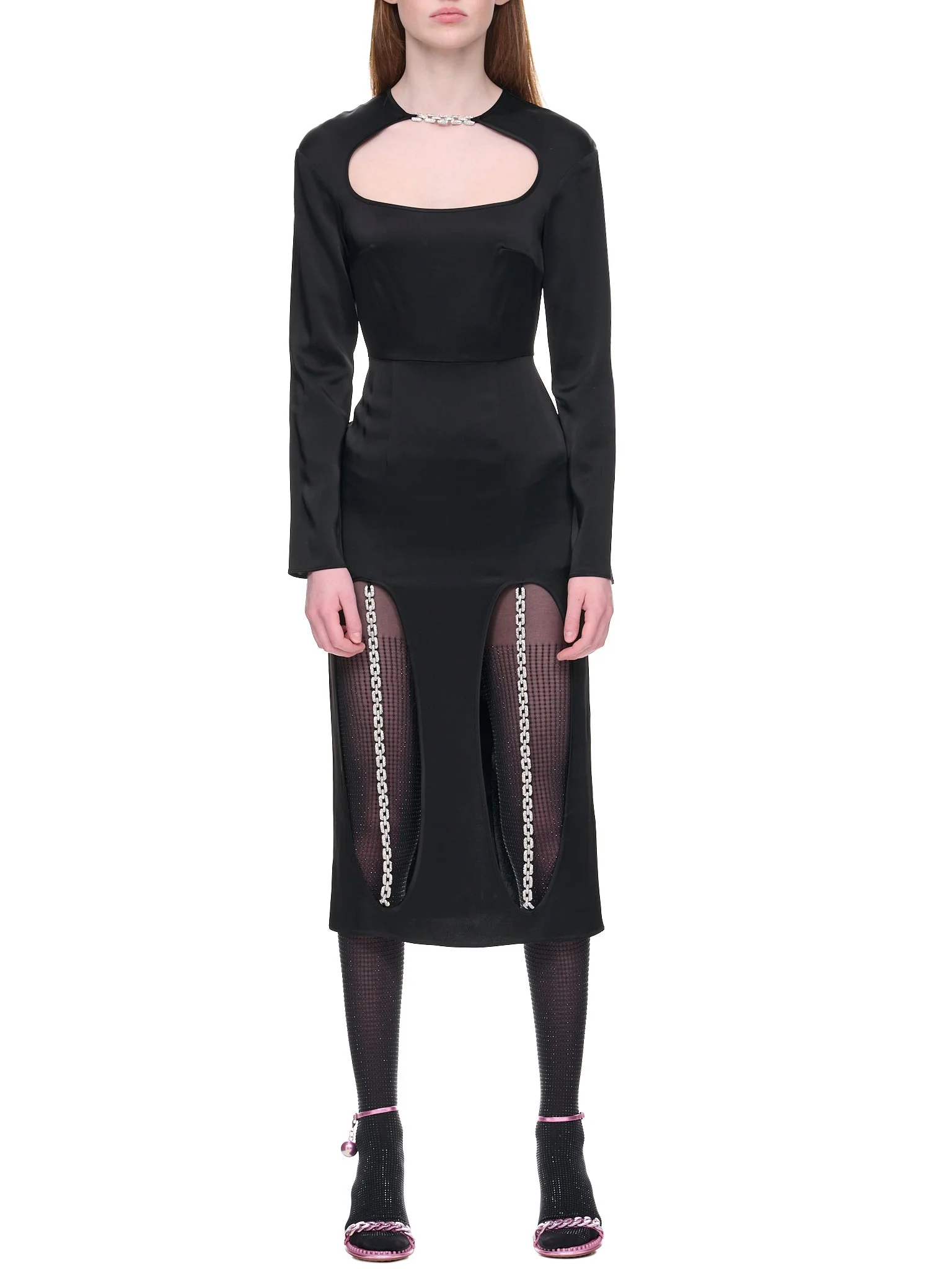 CHRISTOPHER KANE dress in black, satin construction, front & back cut-out details, crystal embellished chains, crewneck, long sleeves, concealed back zip fastening, back center split, mid-length, slim fit. Made in UK Italian Sizing Main - 60% Acetate, 40% Viscose Trim - 100% Metal Embellishment - 100% Glass Model is 5'10" wearing size 38. Bust: 32" Waist: 24" Hip: 34"