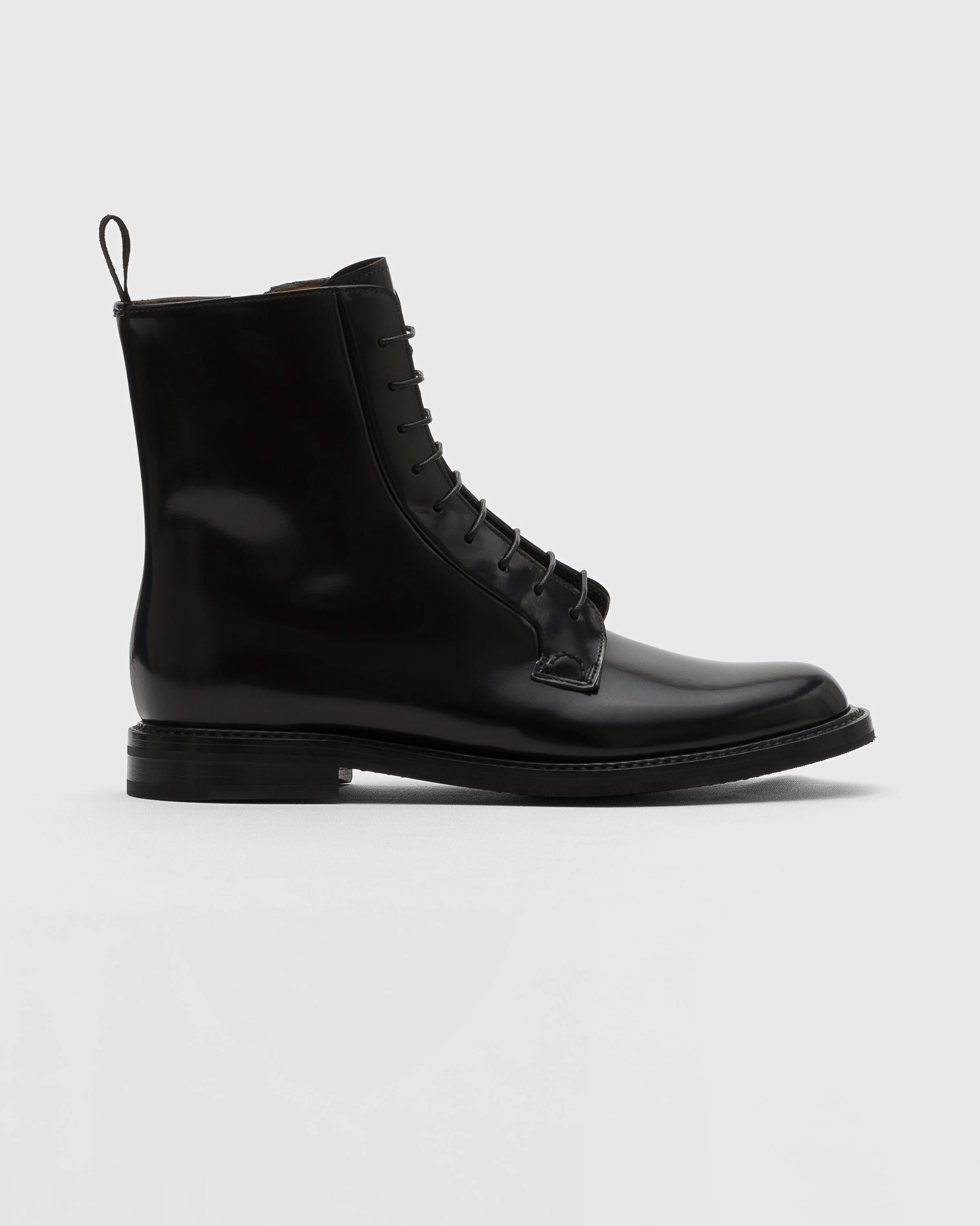 The Alexandra forgoes rich detailing in favour of showcasing its exquisite leather, finished with Church’s polished binder treatment. This glossy effect is achieved by hand-applying exclusive waxes, resulting in a luxurious high-shine. Simple and contemporary with a slimmer sole than our more rugged options, the Alexandra makes the cut for slightly more refined styling. Wear with fitted trousers as an alternative to flat lace-ups. A diamond rubber sole provides extra grip. • Product code: DT0093_9XV_F0AAB • Lace-up derby boot--- • Calf leather with polished binder finish--- • Half moon stitching to eyestay--- • Waxed cotton laces--- • Blind eyelets--- • Cotton pull-on tab to back--- • Diamond rubber sole with leather heel--- • Internal lining for longevity of wear--- • Blake construction--- • Handwritten shoe info to lining--- • Church’s crest to sock and sole • Imported product